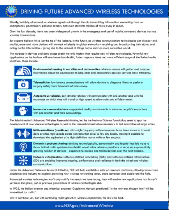 The NSF funding, part of a new White House Advanced Wireless Research Initiative, includes $50 million as part of a partnership with more than 20 mobile companies and trade groups to roll out advanced wireless testing sites in four U.S. cities. The testing will include deployment of small cells to boost signals of high-band, millimeter wave spectrum.